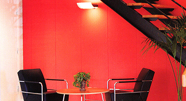 A complement to or instead of an acoustic ceiling. In a courtyard with a glazed rood or a room with some form of roof windows or atrium, sound absorbing wall panels may be more suited than a sound absorbing ceiling.
